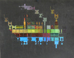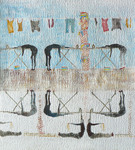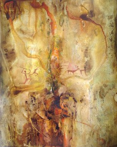 2020Gemaakt van bister en pigment met medium op opzetkarton. Ook chloor en alcohol gebruikt. Thema: grottekeningen