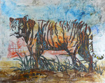 2018Op (zelf) gemarmerd stucloperkarton met acryl geschilderd. Versierde tijger.