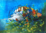 2018Fantasie vis met acryl op papier. Figuratie uit nog te maken boek.