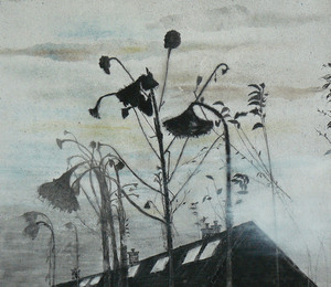 2020Zonnebloemen uit mijn tuin in hun nadagen. Gemaakt van acryl en sumi inkt. Op stucloper.
